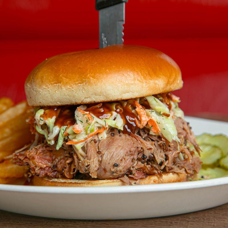 Smoked pulled pork piled high on a bed of slaw with our special BBQ sauce, served on a brioche bun.